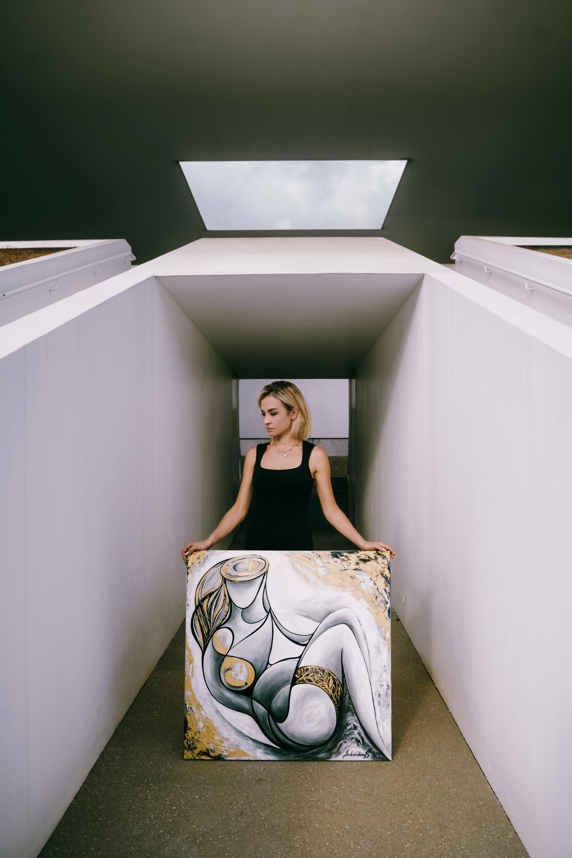 My painting “Forever Golden” carries a rich layering of meaning and contrast between sensuality and motherhood. At first glance, a viewer see a woman’s figure in stockings which evokes sensuality, glamour, and a touch of classic femininity. It suggests confidence, allure, and the timeless aesthetic of elegance. As the viewer looks deeper, the discovery of pregnancy shifts the narrative. What begins as a sensual representation transforms into a celebration of life, nurturing, and transformation. This contrast makes the painting multidimensional, breaking away from stereotypes that often separate the two. In this painting I’m using 24 carats gold which symbolizes purity, eternity and transcendence. It is not only decorative for me but conceptual. Gold symbolises permanence, divine energy, and the unchanging value of creation and life. It elevates the woman into the sacred and turning her not just into an individual but into an archetype of beauty, fertility, and eternal worth. I want viewer to feel the dual identity of woman and acknowledge that she can embody both sensuality and motherhood—two facets of femininity often perceived separately. In my painting they coexist harmoniously.