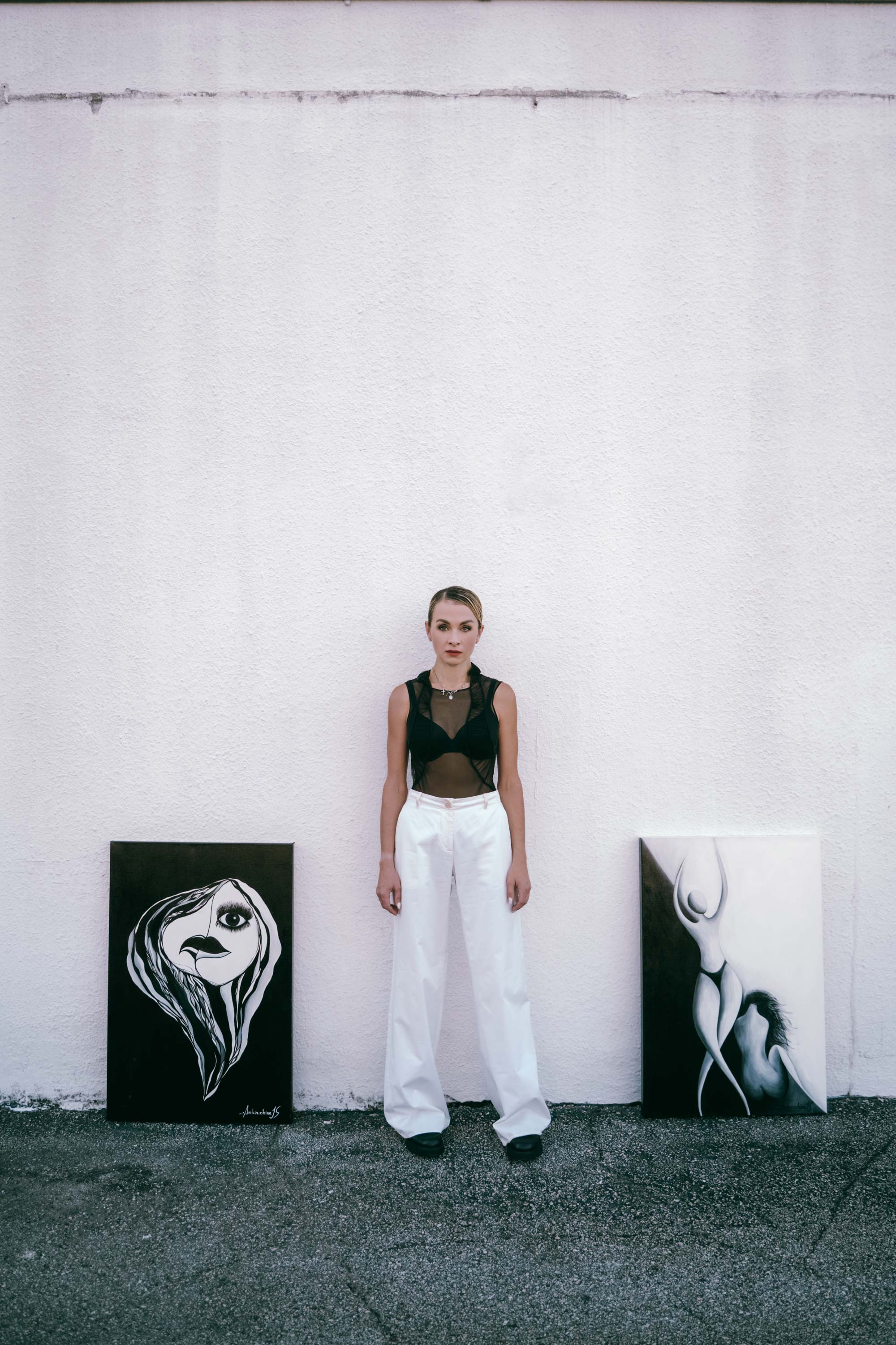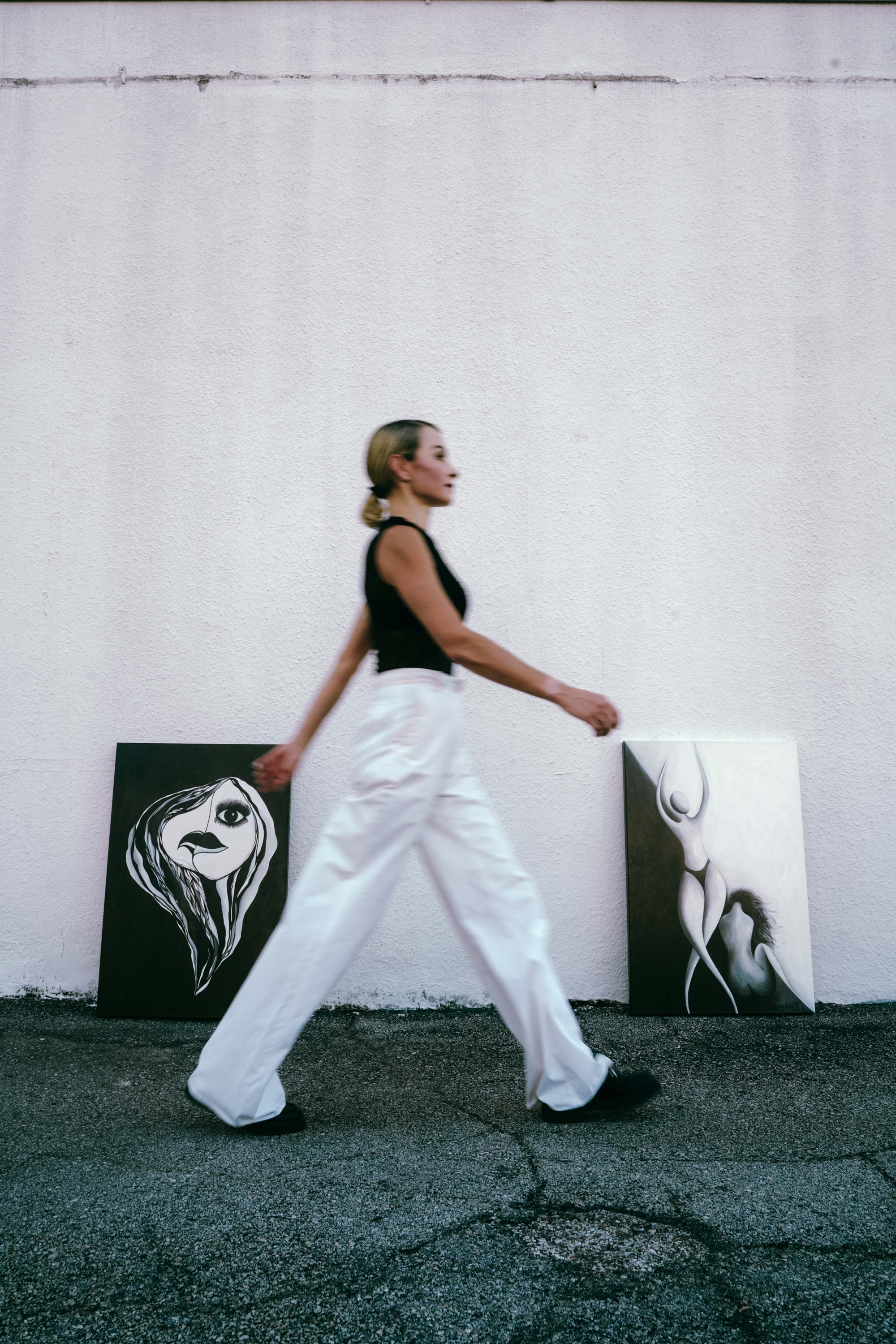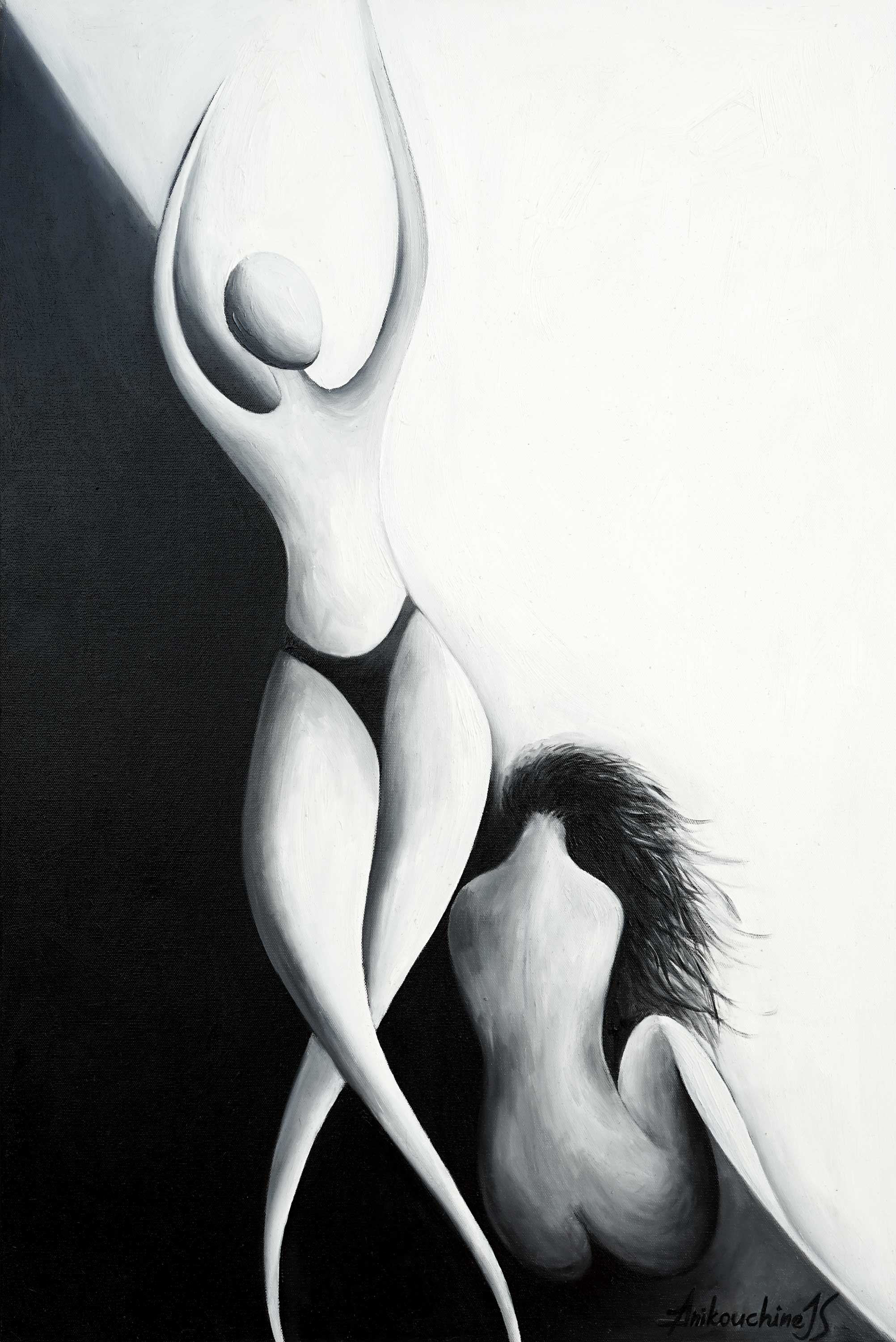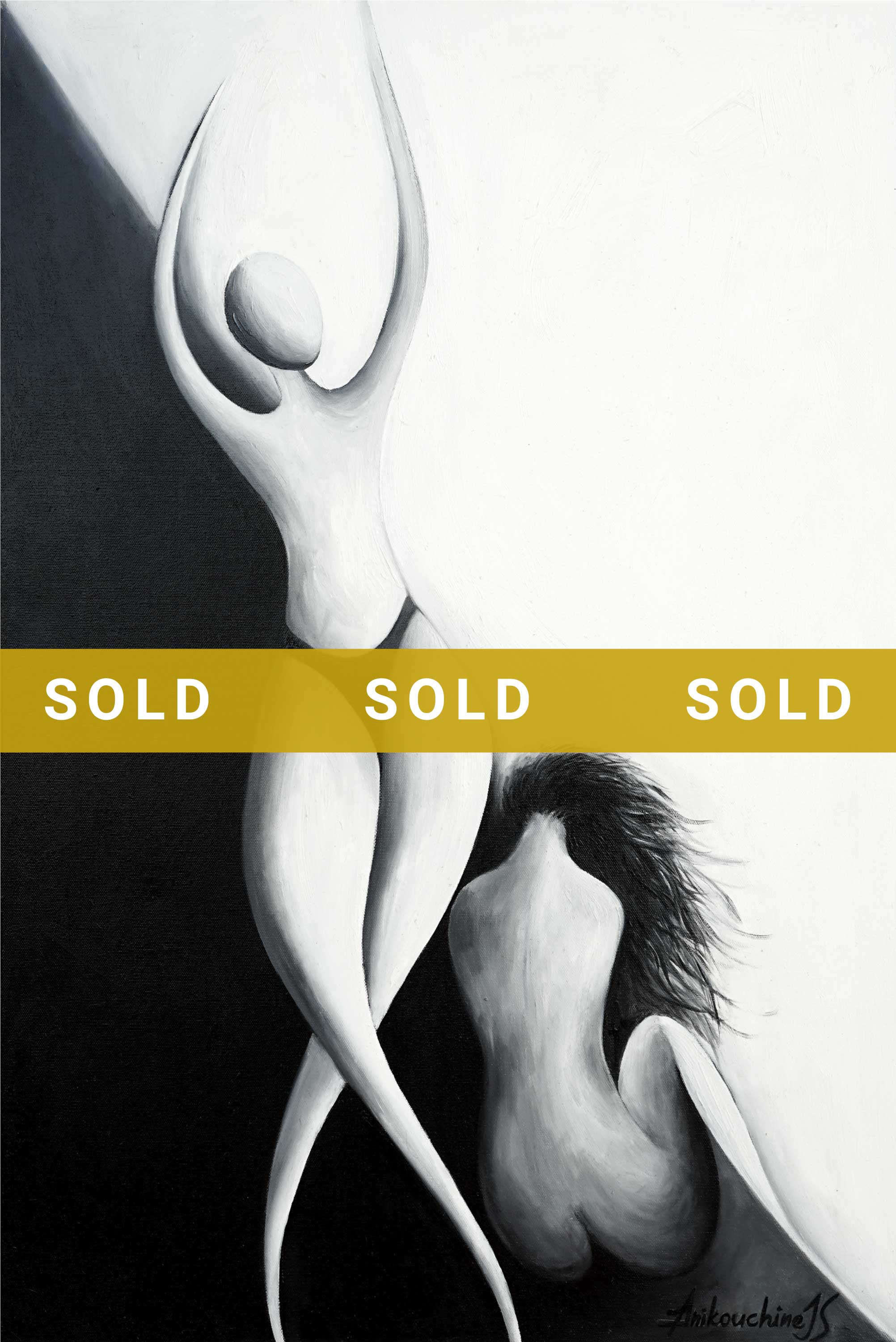 Liberation is not the absence of struggle, it is born from it. One woman’s figure bends under the weight of shadows, carrying the heaviness of all that has been. Yet from that same body, another figure rises. She is faceless, universal, reaching upward with arms wide open. It is the moment of becoming, when darkness no longer defines you, and light is no longer distant.